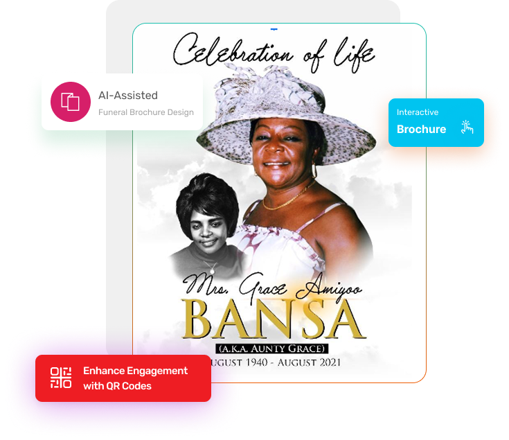 Create personalized funeral brochures with the support of AI. Collaborate with multiple people on a single design, then print it directly or generate a QR code linking to the digital version. Enhance interactivity by connecting the brochure to the Online Condolence Book, donation link, and the Ghana Mmemorial through a QR codes, ensuring a comprehensive and memorable tribute.