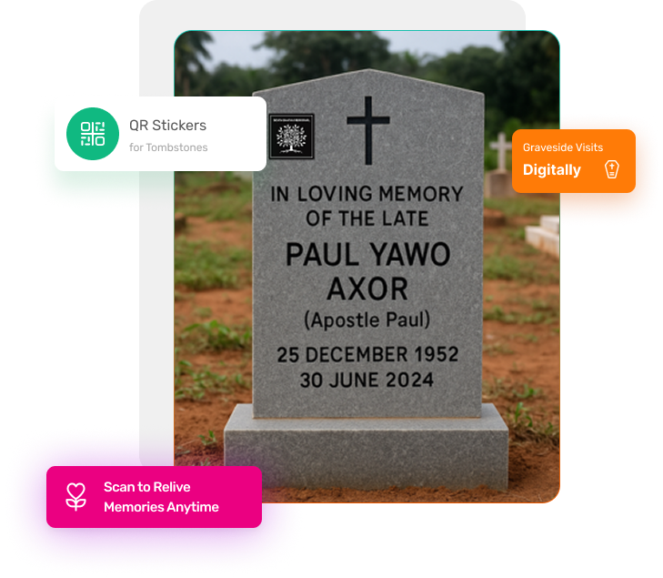 Attach a durable aluminium QR sticker to your loved one’s tombstone and transform every graveside visit. By scanning with a phone, family and friends can instantly access the full Ghana Memorial: life story, photos, videos, even the voice of your beloved one— preserving presence, reflection, and connection forever.