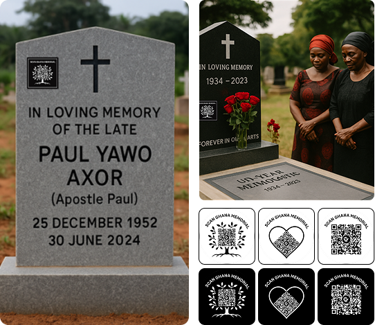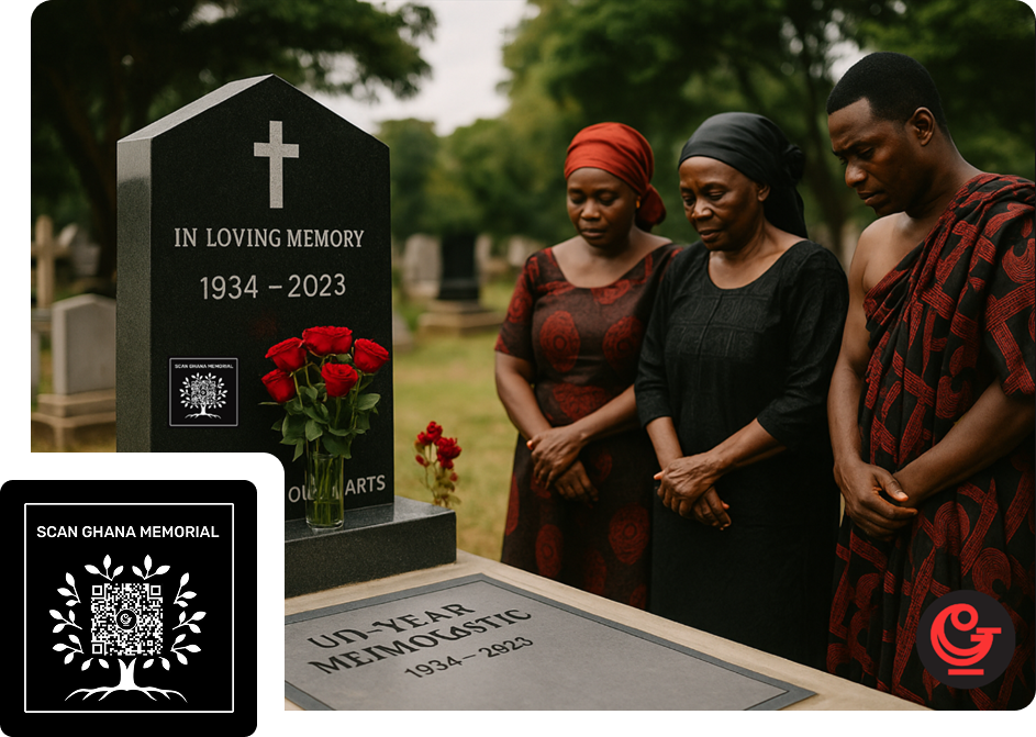 Connect memories to the very place they rest. With a weatherproof QR sticker on the tombstone, every graveside visit opens the Ghana Memorial—photos, tributes, and life stories instantly accessible. A simple scan turns stone into story, making your loved one's legacy forever present.